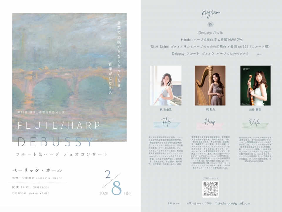 横浜山手西洋館・ベーリック・ホールの素敵な空間でお届けするフルート&ハープのデュオコンサート。大きなコンサートホールとは異なり、当時のサロン時代を感じていただけるような西洋館にて、今回は主にドビュッシーの名曲を。そして、ヴィオラ奏者のゲストをお招きし、ドビュッシー晩年の傑作「フルート、ヴィオラ、ハープのためのソナタ」もお届けいたします。