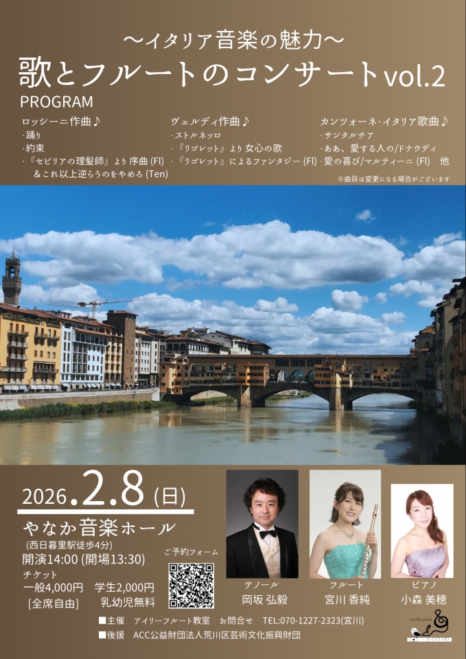 オペラに魅了されたフルーティスト宮川香純、ロッシーニの作品を得意とする実力派テノール歌手岡坂弘毅、オペラ40作品以上演奏経験のあるピアニスト小森美穂の3人がお届けする、イタリア愛の詰まったコンサート!!