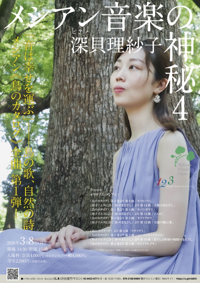 フランスの音楽院を首席で修了、国内外のコンクールで受賞歴をもつピアニストでありながら、権威ある「柴田南雄音楽評論賞」を受賞し音楽評論家としても活躍する異色の音楽家・深貝理紗子が、そのライフワークの中心と言えるメシアン作品に臨みます。渋谷美竹サロン主催のシリーズ第4弾。必聴のオール・メシアン・プログラム!!