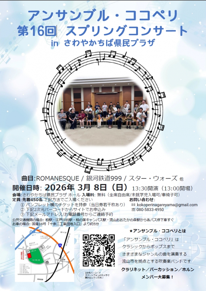 銀河鉄道もスター・ウォーズも!吹奏楽で旅する音楽の宇宙? 吹奏楽バンド「アンサンブル・ココペリ」による無料コンサートを開催します!銀河鉄道999やスター・ウォーズなど名曲満載。ぜひご家族でお越しください!お申し込みは添付のQRコード/HP/電話からよろしくお願いいたします。