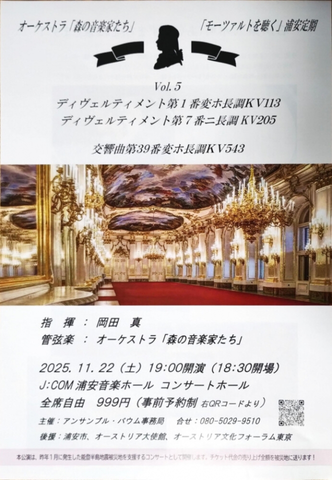 浦安音楽ホールで開催するモーツァルトを聴く演奏会。第5回目は後期3大交響曲のひとつ交響曲第39番をアンサンブル・バウムの有志メンバーで演奏します。