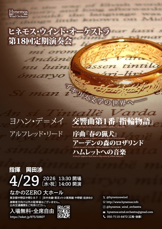第10回定期でも演奏したデ⁼メイの交響曲第1番「指輪物語」にA.リードの「ハムレットへの音楽」など3曲をカップリングしました。