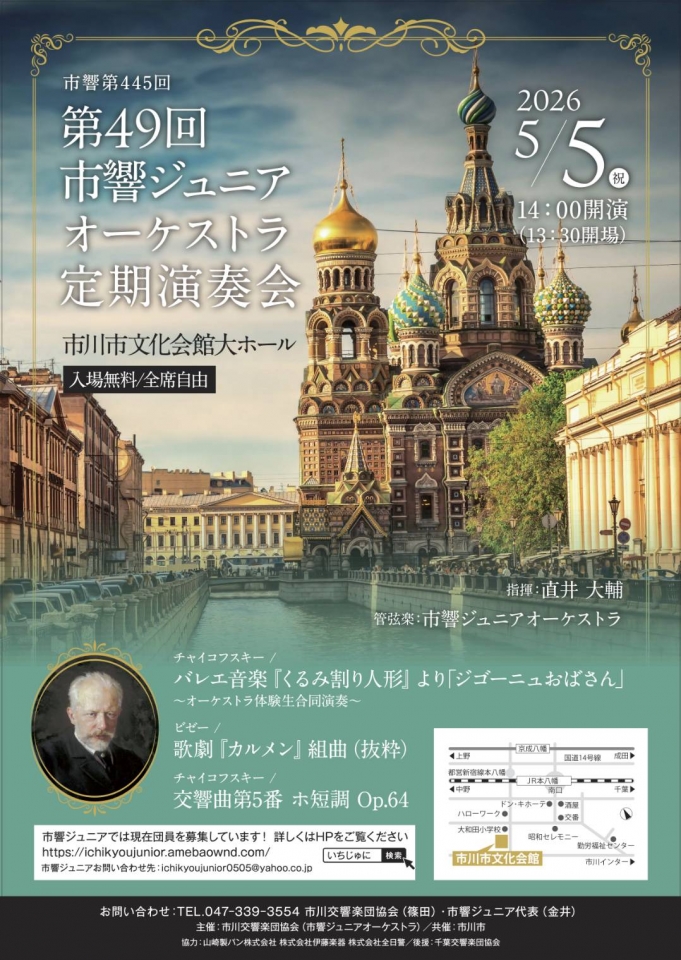 市響ジュニアオーケストラは、毎年、5月5日に演奏会を開催しています。今回も、市川交響楽団、市川交響吹奏楽団も加わって演奏します。