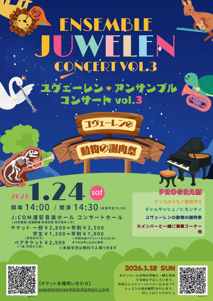 ユヴェーレンメンバーによるここでしか聴けない動物の謝肉祭!個性溢れる演奏からメンバーと一緒に演奏できるコーナーまで盛りだくさんのコンサートとなっております。