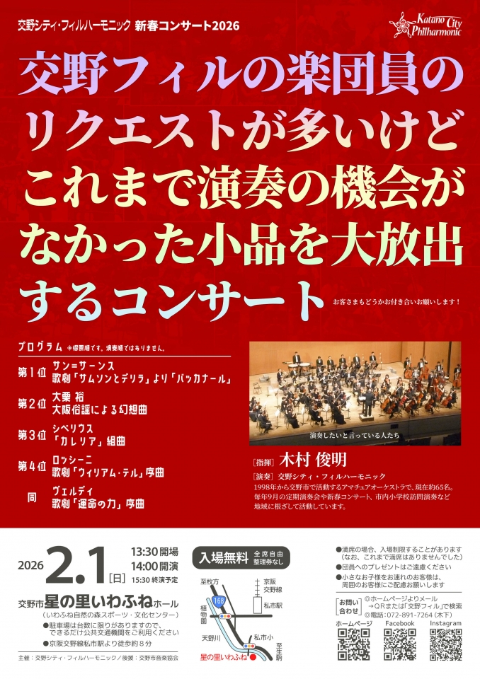 交野フィル恒例となりました新春コンサート。2026年は、「交野フィルの楽団員のリクエストが多いけど、これまで演奏の機会がなかった小品を大放出するコンサート」と銘打ちまして、「難しすぎて・・!?」いえいえ「楽しみにとっておいた!」名曲を演奏致します!