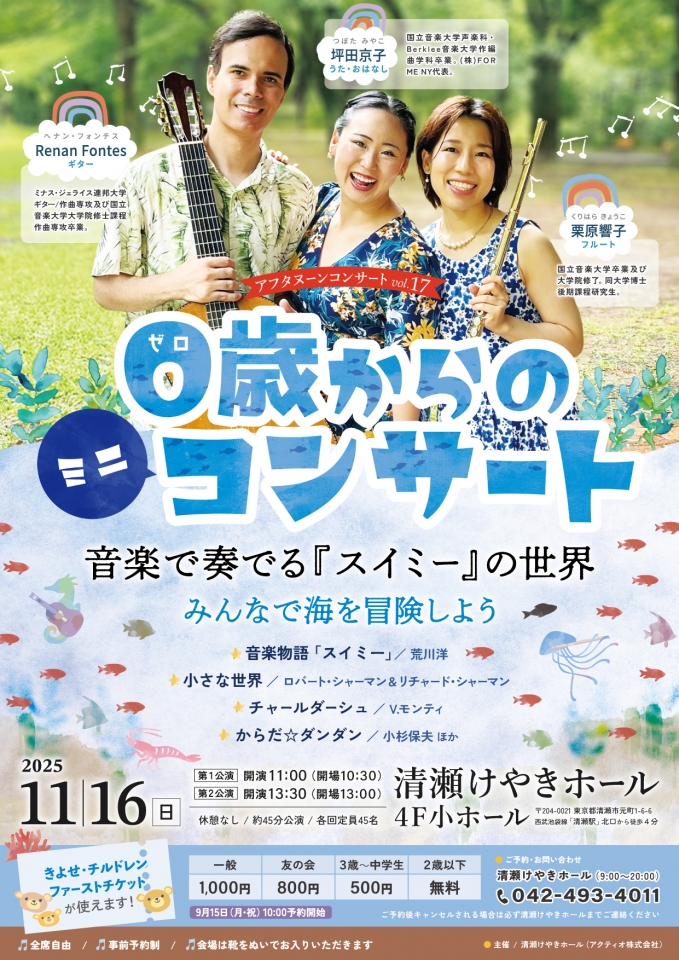 0歳からご参加いただける親子向けミニコンサート。絵本『スイミー』の音楽物語を中心に、フルートとギターの優しい音色に合わせて歌とお話が展開します。「小さな世界」、「チャールダーシュ」、「からだ☆ダンダン」など、子どもも大人も楽しめる多彩なプログラムをお届け。約45分のステージで、座布団・マットのスペースもあり、ゆったりと親子で音楽の魅力を楽しむことができます。