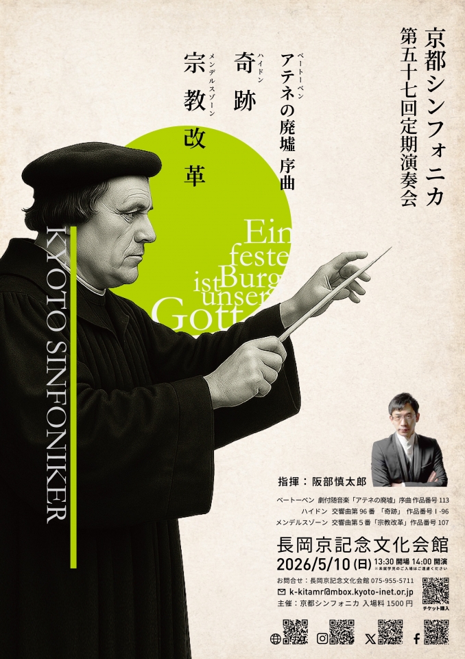 次の演奏会は、阪部慎太郎氏の指揮で、ベートーヴェン/劇付随音楽「アテネの廃墟」序曲・ハイドン/交響曲第96番「奇跡」・メンデルスゾーン/交響曲第5番「宗教改革」を演奏いたします。前回とは対照的にコンパクトな演奏会で、洗練された演奏を目指しております。どうぞ、お越しいただければ幸いに存じます。