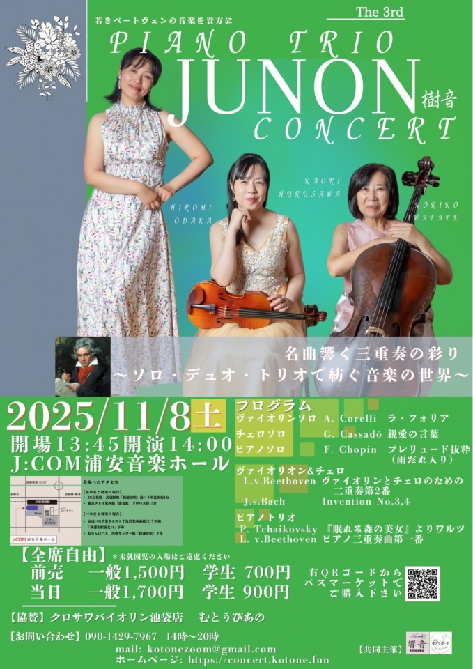 ピアノ、ヴァイオリン、チェロのトリオが、それぞれソロ、デュオ、トリオと編成を替え紡いでゆく音楽の世界をお楽しみください。ソロは、ヴァイオリンでA.Corelli作曲のラ・フォリアを演奏。チェロはG.Cassadó作曲の親愛なる言葉を演奏。ピアノはF.Chopin作曲プレリュードを抜粋で。(15番雨だれ入り) ヴァイオリン&チェロのデュオではL.v.Beethoven作曲のヴァイオリンとチェロの為の二重奏第2番。最後にトリオでP.Tchaikovsky作曲眠れる森の美女のワルツ、J.Strauss作曲美しき青きドナウ。そして最後にL.v.Beethoven作曲ピアノ三重奏曲第一番を演奏したします。 それぞれの楽器の音を楽しみながら、合わさる楽器の変化で音楽が豊かに紡がれていく変化を存分にお楽しみください。 普段は講師業や子供向け親子コンサートを開催しているピアノトリオ樹音の3人がクラシック音楽に真摯に向き合い研鑽を積み重ねました。年に一度の本気コンサートを応援してください。