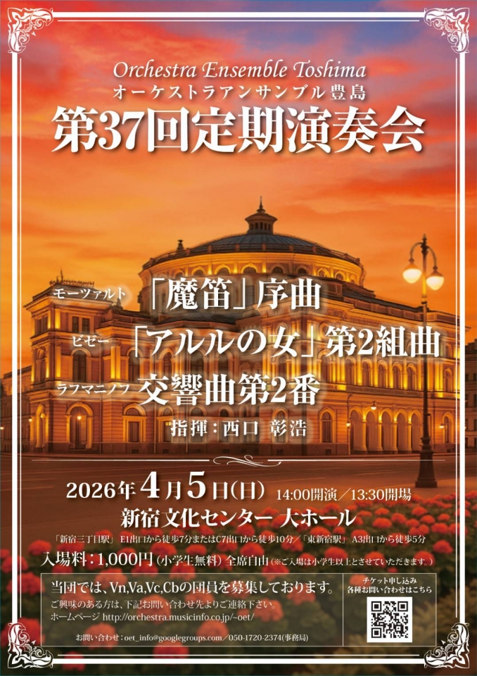 ラフマニノフ交響曲第2番、ビゼー「 アルルの女」第2組曲、モーツァルト「魔笛」序曲を新宿文化センター大ホールにて演奏します!