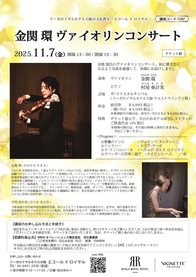 リーガロイヤルホテル大阪の文化教室「エコールドロイヤル」 金関 環 ヴァイオリンコンサート