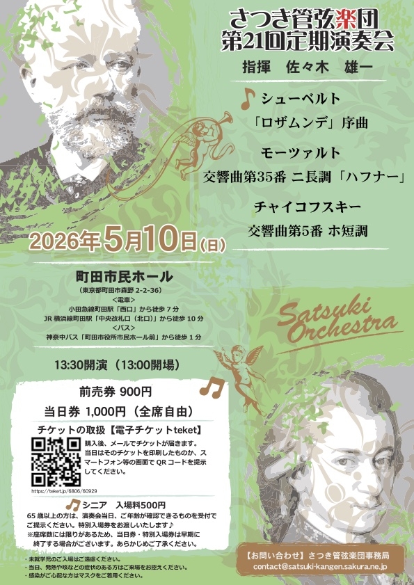 チャイコフスキーの名曲交響曲第5番をメインに、モーツァルトやシューベルトなど様々な時代の曲を演奏します。