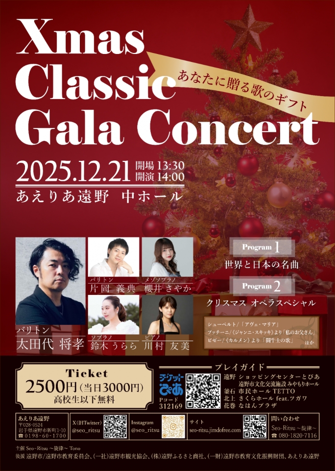 岩手のオペラ界を牽引する太田代将孝さんをはじめ 若手のプロ声楽家たちがクリスマスソングを混じえ一度は聴きなじみのあるクラシックの名曲・日本の名曲・ピアノの名曲を豪華に華やかにお届けいたします。クリスマスという特別な日に非日常的な空間で心を癒しにきませんか?
