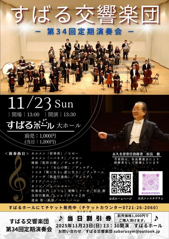 大阪で34年間活動を続けていますアマチュアオーケストラ「すばる交響楽団」です。アマチュアらしからぬ「すばる(素晴)」らしい演奏を目指し日々練習を重ねています。招待券入手方法: 招待券を10枚ご用意しています(お1人様2枚まで)。
