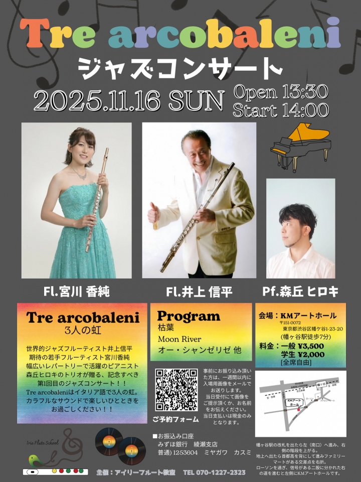 世界的ジャズフルーティスト井上信平、期待の若手フルーティスト宮川香純、幅広いレパートリーで活躍のピアニスト森丘ヒロキのトリオが贈る、記念すべき第1回目のジャズコンサート!!
