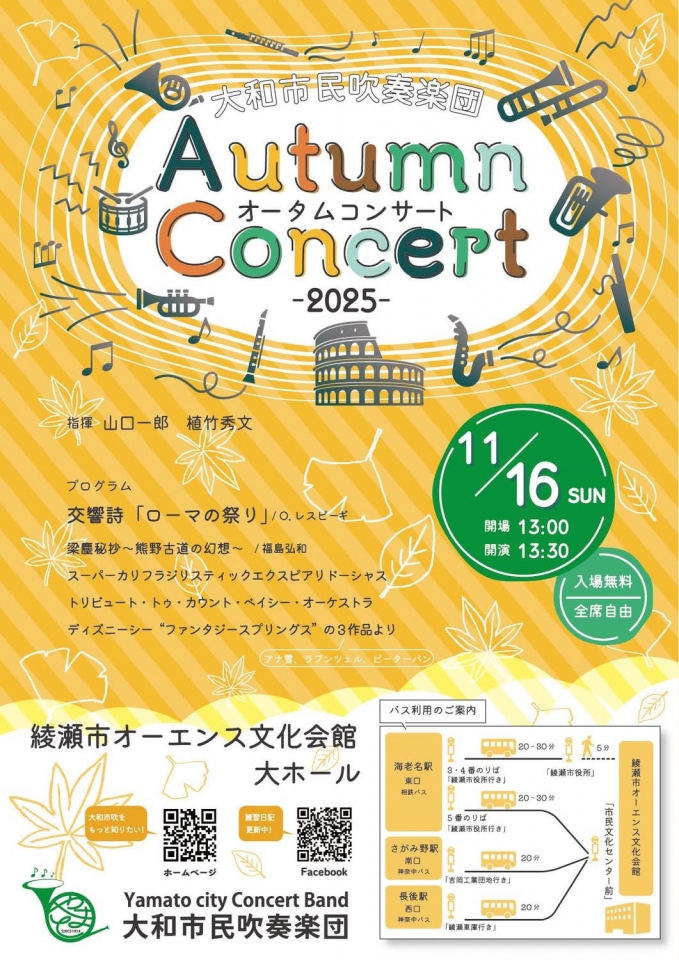 この度、オータムコンサートを開催する運びになりました。なるべくお客様が聞いたことのある曲を一曲はあるようにご用意しておりますので、ご家族、ご友人お誘い頂きお越し下さい。団員一同、ご来場お待ちしております。
