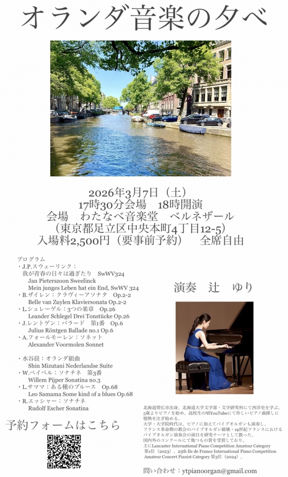 バロック時代から21世紀までにオランダで作曲されたピアノ曲と、オランダにて学んだ作曲家の水谷晨さんのピアノ曲を演奏します。