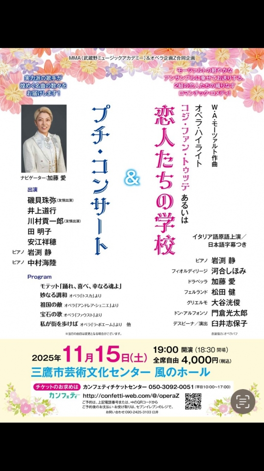 実力派歌手による名曲コンサート(ナビゲーターのご案内付き)と、オペラ「コジ・ファン・トゥッテ」のハイライト公演です。秋の夜長に音響の素晴らしいホールで美声をお楽しみください。無料ご招待あります。たくさんのご応募をお待ちしています!招待券入手方法: 抽選で50組100名様をご招待。